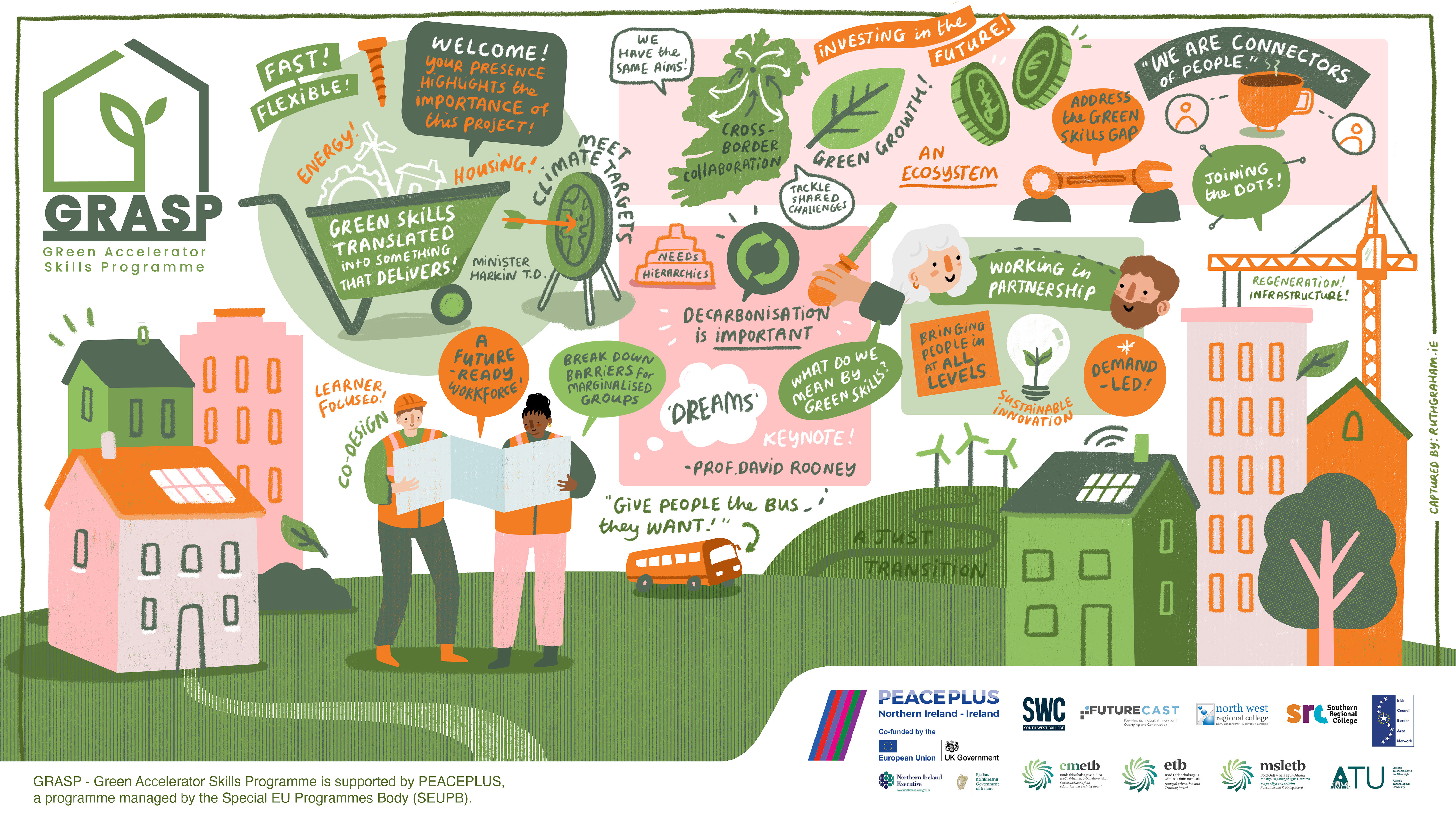 GRASP is supported by PEACEPLUS, a programme managed by the Special EU Programmes Body (SEUPB). The project brings together a diverse network of partners across nine counties, operating from CREST (Centre for Renewable Energy & Sustainable Technology) Enniskillen. Lead Partner South West College (SWC) is working in collaboration with South Regional College (SRC), North West Regional College (NWRC), Irish Central Border Area Network (ICBAN), Cavan and Monaghan Education and Training Board (CMETB), Donegal Education and Training Board (DETB), Mayo, Sligo, Leitrim Education and Training Board (MSLETB), Atlantic Technological University (ATU) and Future Cast.